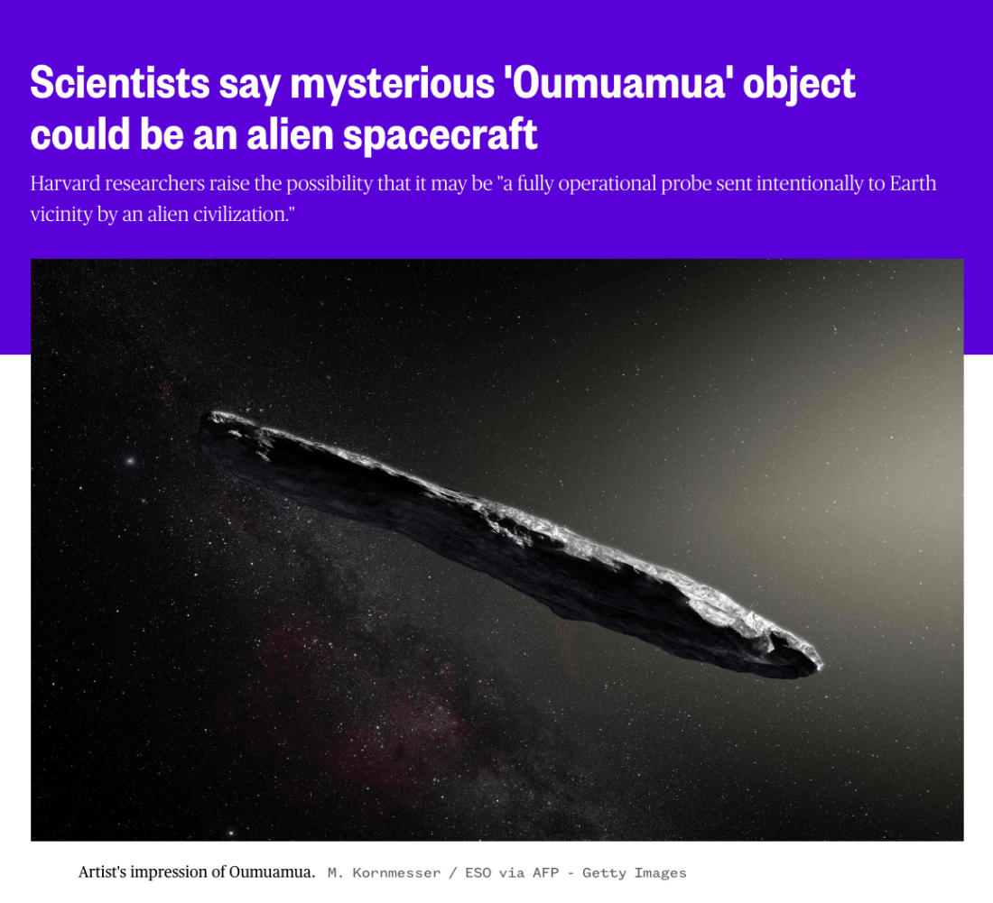 The researchers aren’t claiming outright that aliens sent Oumuamua. But after a careful mathematical analysis of the way the interstellar object sped up as it shot past the sun, they say Oumuamua could be a spacecraft pushed through space by light falling on its surface — or, as they put it in the paper, a “lightsail of artificial origin.” (source)